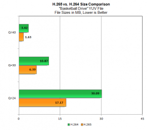 در ویدیوها هر چه میزان حرکت در تصویر کمتر باشد، حجم آن نیز کاهش مییابد. علاوه بر آن، نوع تصویربردای نیز در حجم تصاویر حاصل شده تاثیرگذار است. این روش فشردهسازی عموما میتواند تصاویر را تا دو برابر فشرده کند. کیفیت نهایی تصویر در این روش فشردهسازی به مراتب بالاتر از فشردهسازی H.264 است