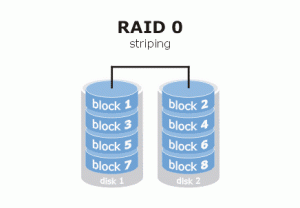 Striping : در این نوع پیکربندی، تمامی اطلاعات و داده ها در سراسر هارد دیسک تقسیم بندی می شوند. این ساختار، عملیات خواندن و نوشتن را ، نسبت به سیستم حاوی یک هارد، سریع تر انجام می دهد. (RAID 0)