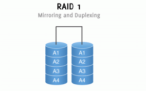این نوع RAID تحت عنوان mirroring solution هم شناخته می شود. در این سطح، تمام داده ها بر روی دو درایو یکسان ضبط می شوند، به طوری که دو نسخه از آنها وجود داشته باشد. در این صورت اگر یکی از درایورها خراب شود، کپی آن بر روی درایو دیگر به کار خود ادامه می دهد.