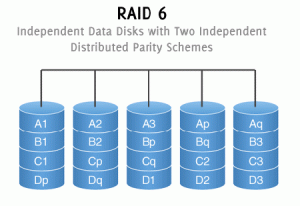 فناوری RAID 6 یک نسخه توسعه یافته از RAID 5 است که می تواند از از بین رفتن اطلاعات نه تنها یک ، بلکه دو خرابی همزمان درایو دیسک جلوگیری کند. برای این کار RAID 6 به فضای دیسک بیشتری احتیاج دارد، به همین دلیل کارایی کمتری نسبت به RAID 5 دارد.